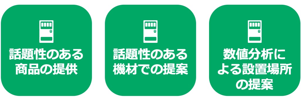 飲料水自販機の他、和菓子、洋菓子、肉、魚等といった、今迄にない商品を取扱い、店舗では並んでしか購入できない商品や、自販機限定商品を開発して、話題性や期待感を創出するような自販機の展開を目指します。